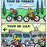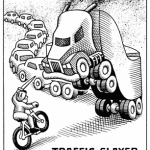 Andy Singer é um cartunista norte-americano que desenvolve seu trabalho a partir de charges políticas. Nessa linha, Singer dedicou muitos de seus trabalhos às bicicletas, especialmente ao seu uso como meio de transporte na cidade. Abordando o caos do trânsito e os movimentos de cicloativismo como a massa crítica, Singer possui um traço que o identifica facilmente no universo do cartoon.