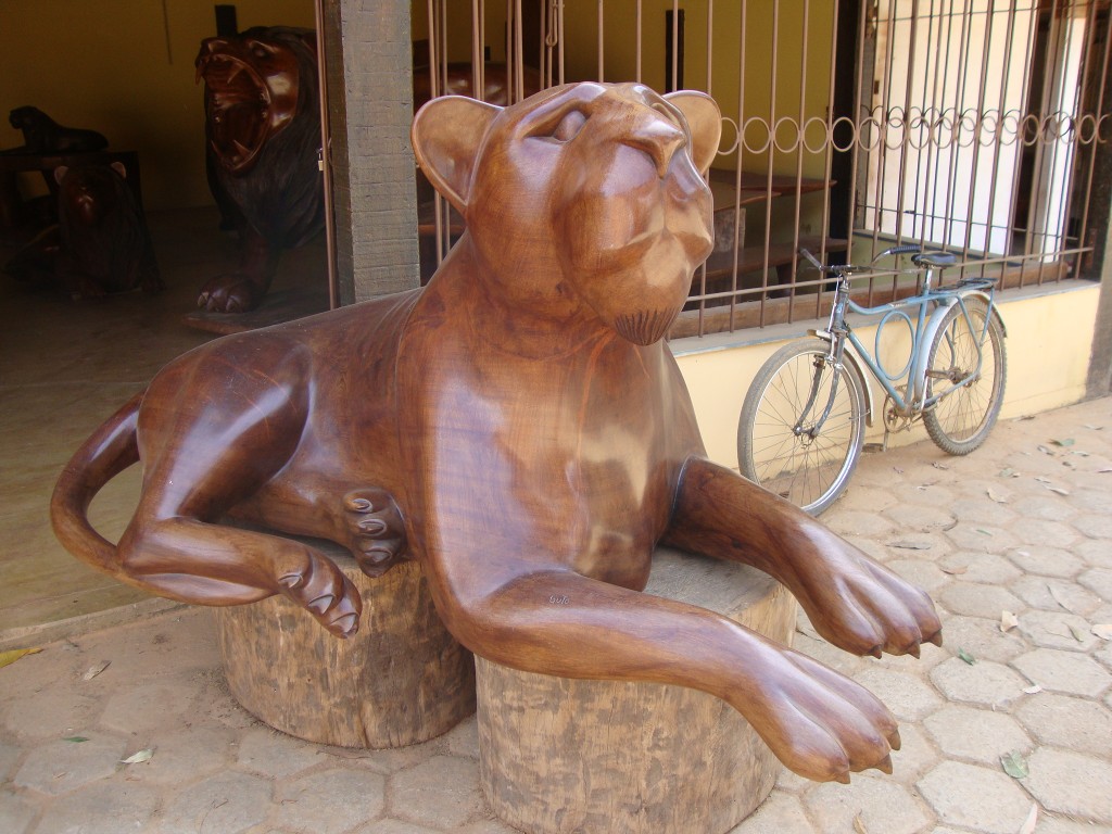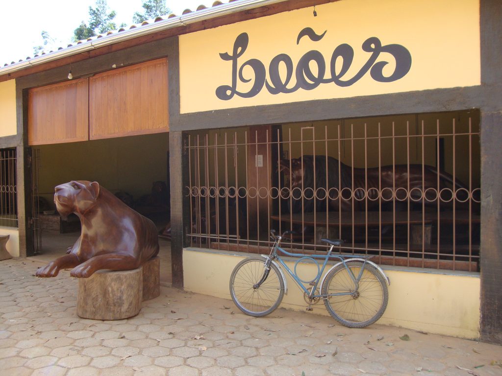 Bicicleta antiga muito bem protegida, por leões e leoas gigantes. As fotos foram tiradas na Vila Carassa, que fica próxima a cidade de Prados (MG), durante a cicloviagem pela Estrada Real feita pelo blog. Na Vila Carassa existem várias oficinas especializadas no artesanato em madeira. Os trabalhos são lindos, vale a pena visitar!