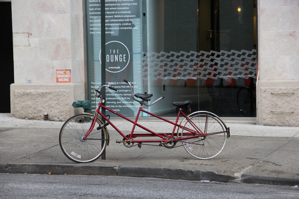 Nova Iorque tem muitas bicicletas presas em postes e paraciclos (muitas mesmo!), e algumas delas dão sinal de já estarem por lá há um bom tempo. Nessa foto dá pra perceber pelo pneu dianteiro e pela falta do pneu traseiro, que a dupla que pedalava essa tandem provavelmente não quis mais pedalar junto… hehehe