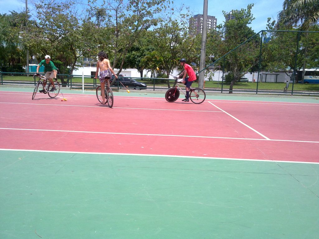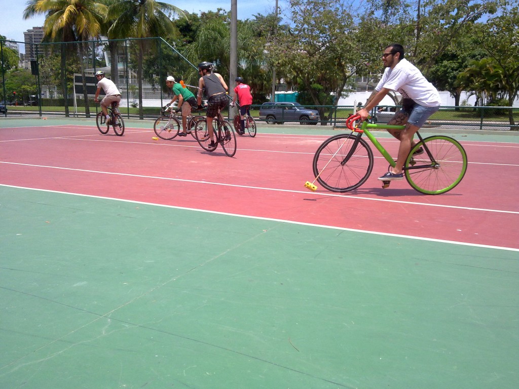 Estava pedalando ontem na Lagoa Rodrigo de Freitas, no Rio, e vi uma galera jogando bike polo! Pra quem não conhece, trata-se do jogo de polo (que costumamos ver mais sobre cavalos ou patins) jogado com bicicletas! Os jogadores se dividem em times e usam tacos para empurrar a bolinha com o objetivo de marcar gols. Eu já tinha visto apenas em fotos, em um livro sobre bicicletas que tenho. Deu uma vontade danada de jogar! Deve ser muito divertido! Abaixo algumas fotos do jogo.
